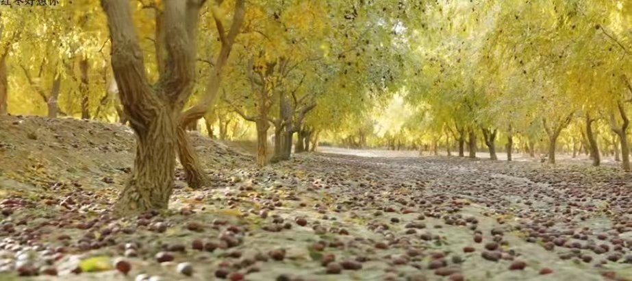 金秋夜放红枣树。竹打落、星如雨。万棵庄园香满路。笼灯高挂,霓虹旋转,漫步观歌舞。