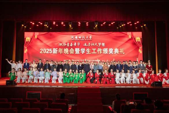 “激扬青春年华,追寻科大梦想”2025新年晚会暨学生工作颁奖典礼上,欢歌笑语,精彩纷呈。校领导为获得表彰的学生工作先进集体和个人颁奖。原创歌曲《祖国万岁》、歌曲联唱《岁月如歌》等歌颂了新中国成立 75 年来的辉煌成就。河洛大鼓《科大再谱新篇章》、情景歌曲《在这里》等展现了广大师生凝心聚力、踔厉奋发的精神风貌。健美操《青春节奏》、舞蹈《追梦》等表达了青年学子为强国建设、民族复兴伟业挺膺担当的决心。歌伴舞《托起明天》奏响的奋进旋律将现场气氛推向高潮。