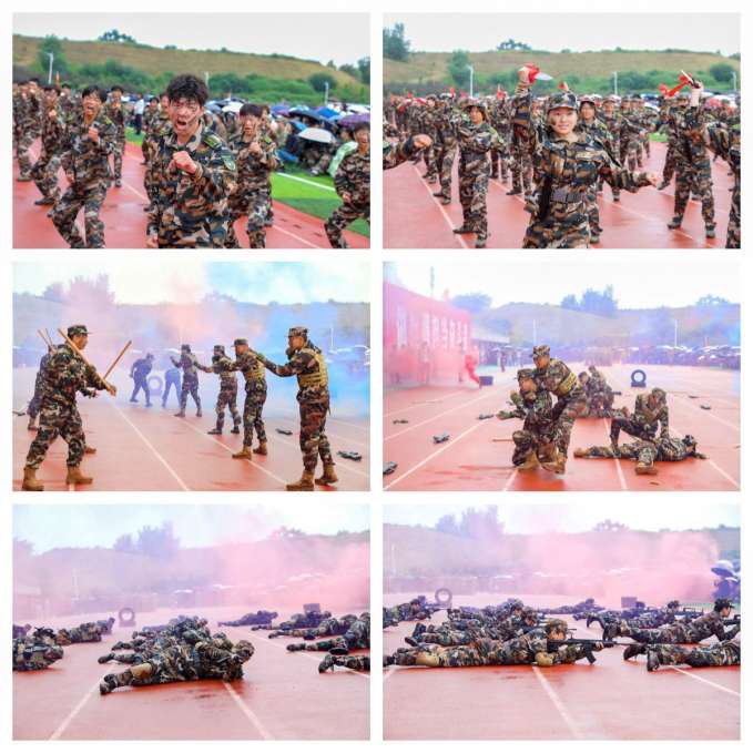 大会在庄严的国歌声中开始,国旗护卫队护送国旗与校旗入场,各参训方阵依次通过主席台接受检阅,同学们步伐铿锵、口号嘹亮,展现出昂扬向上的精神风貌。随后的军体拳、棍术、匕首操、刺杀操、战术演练等科目展示将气氛推向高潮,赢得全场热烈掌声。