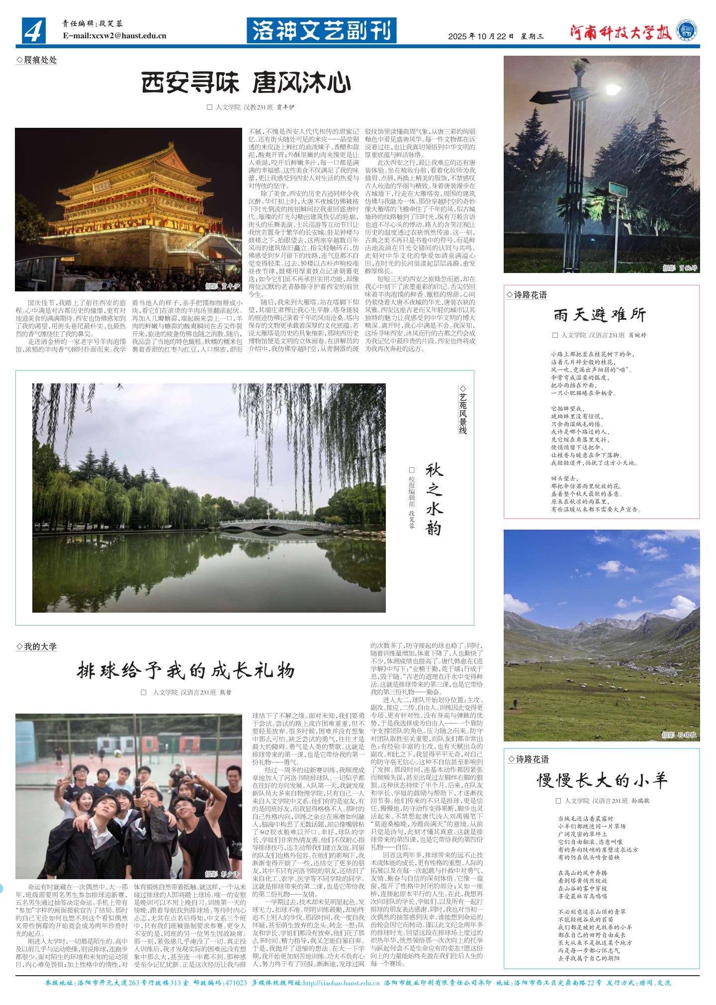 经过一周多的迎新赛训练,我顺理成章地加入了河洛书院排球队。一切似乎都在往好的方向发展。入队第一天,我就发现新队员大多来自物理学院,只有自己一人来自人文学院中文系。他们有的是室友,有的是同班好友,而我显得格格不入。那时的自己性格内向,训练之余总在琢磨如何融入,脑海中构思了无数话题,却总像嘴唇粘了 502 胶水般难以开口。幸好,球队的学长、学姐们非常热情友善。他们不仅耐心指导排球技巧,还主动帮我们建立友谊。同届的队友们也格外包容。在他们的影响下,我渐渐变得开朗了一些,还结交了更多的朋友,其中不只有河洛书院的朋友,还结识了来自化工、农学、医学等不同学院的同学。这就是排球带来的第二课,也是它带给我的第二份礼物——友情。
