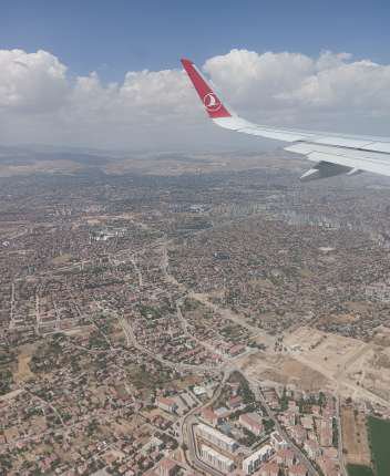 20日,坐着回机场的大巴,继续乘飞机前往最终的访学目的地科尼亚。然而,土耳其国内的航班没有那么准时,在等待了数个小时之后,才得以在高空欣赏土耳其的领土。沿海的森林植被茂密,有一种天然氧吧的感觉;而越深入内地,绿色则成为一种奢侈品,怪不得近年来有报道称,土耳其有沙漠化的风险。