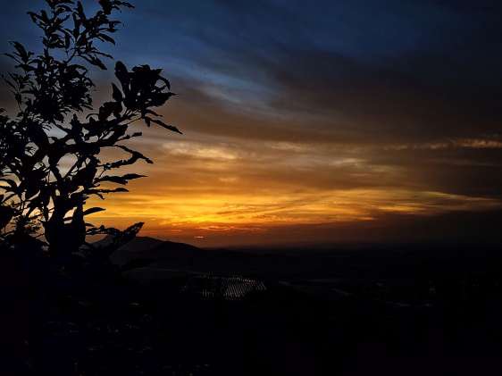 橘先是稠稠地滞留在西边天际,像舍不得化开的蜜,而后才一寸一寸,渗进底下那片越来越深的靛蓝里。金与蓝在交界处彼此浸润、缠绕,晕染出橘的、灰的、棕的缤纷颜色——恍若谁失手打翻了一杯渐变的酒,那酒液并不急着流淌,只是徐徐地、沉沉地,把整个天空都浸出一种微醺的层次来。