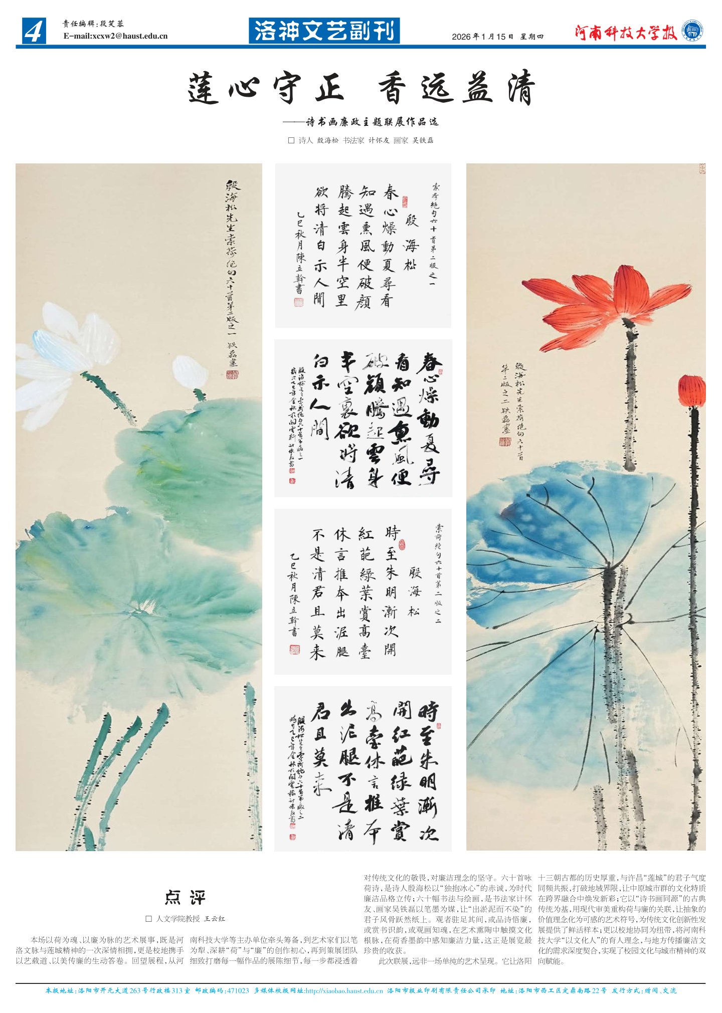 此次联展,远非一场单纯的艺术呈现。它让洛阳十三朝古都的历史厚重,与许昌“莲城”的君子气度同频共振,打破地域界限,让中原城市群的文化特质在跨界融合中焕发新彩;它以“诗书画同源”的古典传统为基,用现代审美重构荷与廉的关联,让抽象的价值理念化为可感的艺术符号,为传统文化创新性发展提供了鲜活样本;更以校地协同为纽带,将河南科技大学“以文化人”的育人理念,与地方传播廉洁文化的需求深度契合,实现了校园文化与城市精神的双向赋能。