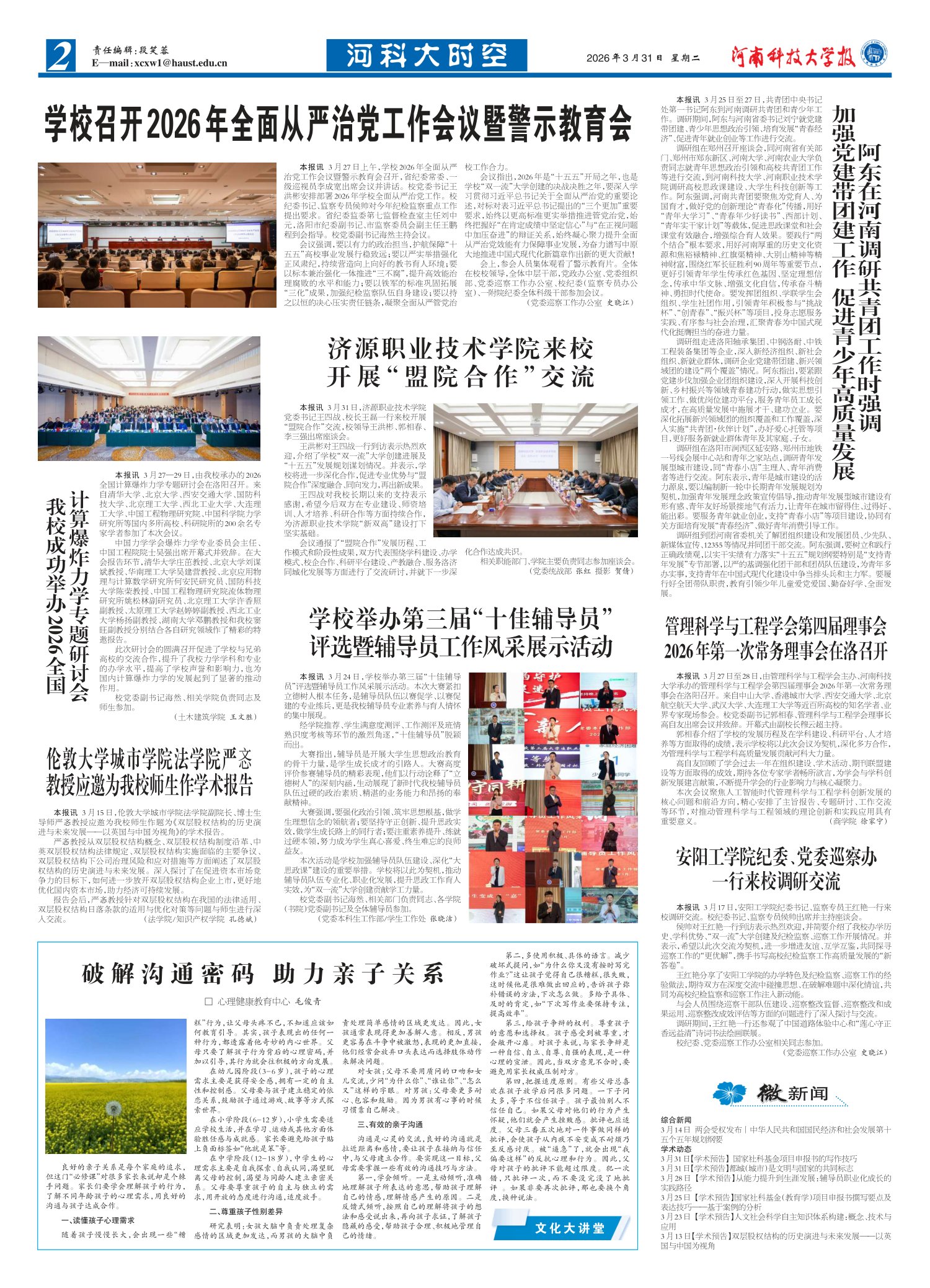 会议指出,2026 年是“十五五”开局之年,也是学校“双一流”大学创建的决战决胜之年,要深入学习贯彻习近平总书记关于全面从严治党的重要论述,对标对表习近平总书记提出的“三个更加”重要要求,始终以更高标准更实举措推进管党治党,始终把握好“在肯定成绩中坚定信心”与“在正视问题中加压奋进”的辩证关系,始终凝心聚力提升全面从严治党效能有力保障事业发展,为奋力谱写中原大地推进中国式现代化新篇章作出新的更大贡献!