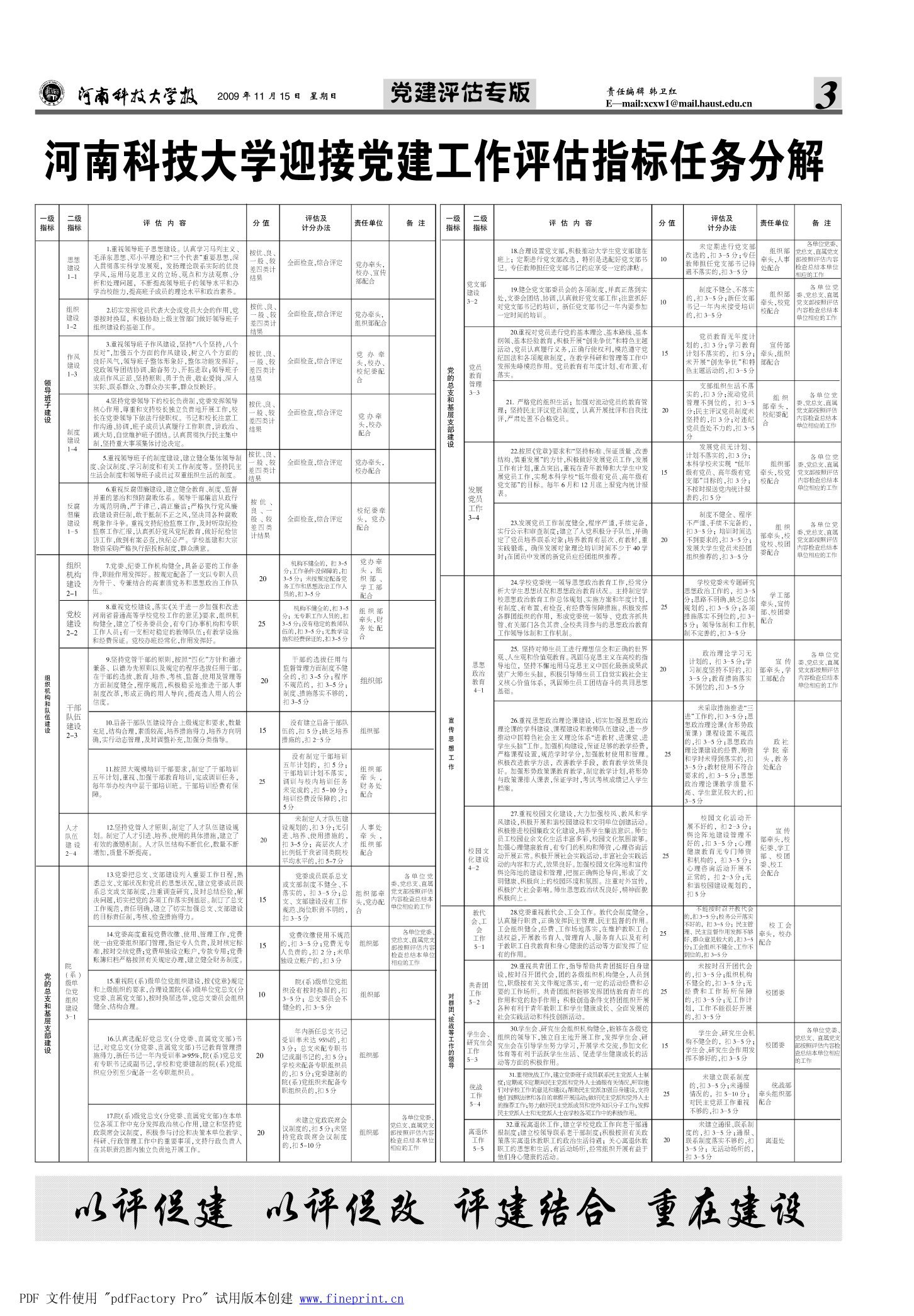河南科技大学迎接党建工作评估指标任务分解