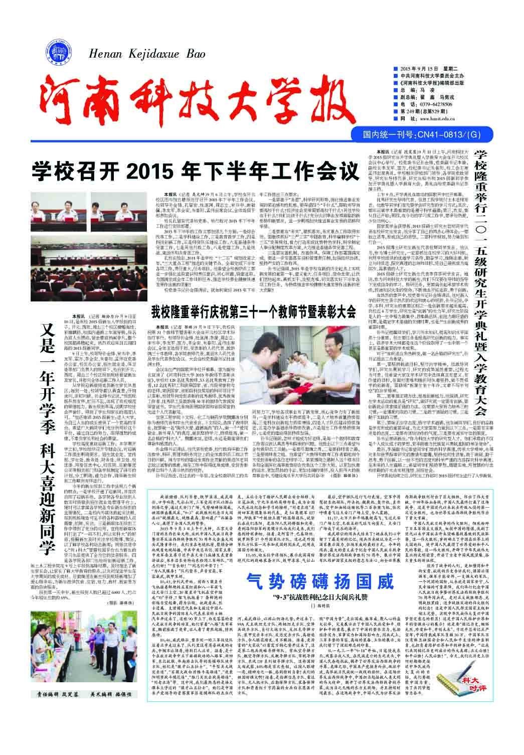 本报讯(记者段笑蓉)9月11日上午,河南科技大学2015级研究生开学典礼暨入学教育大会在开元校区会议中心举行。校党委书记孙金锋,党委副书记李漪,副校长李友军、雷方,校纪委书记朱春阳,校工会主席孟伟出席
