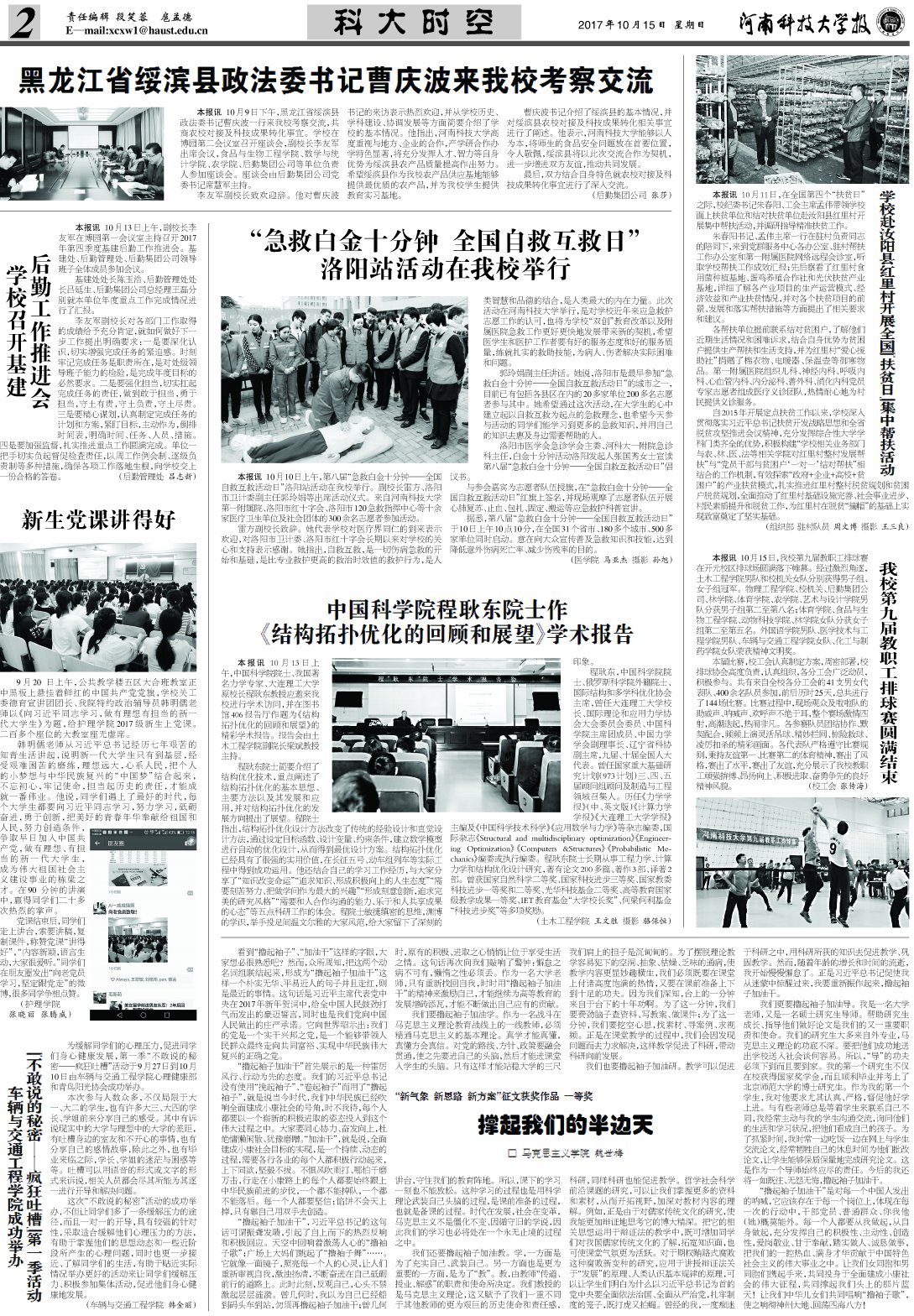 本报讯10月13日上午,中国科学院院士、我国著名力学专家、大连理工大学原校长程耿东教授应邀来我校进行学术访问,并在图书馆406报告厅作题为《结构拓扑优化的回顾和展望》的精彩学术报告。报告会由土木工程学