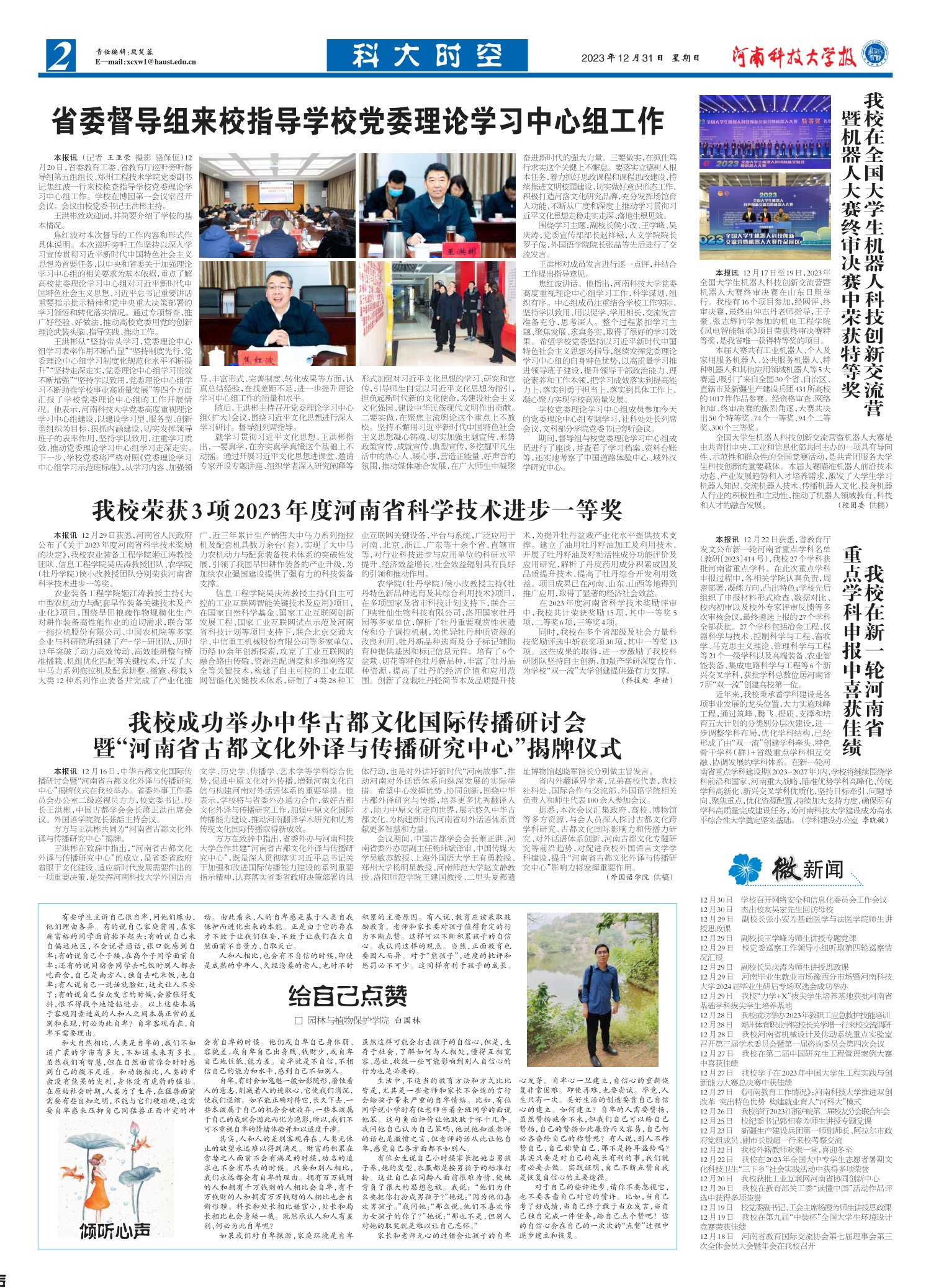 本报讯12月29日获悉,河南省人民政府公布了《关于2023年度河南省科学技术奖励的决定》,我校农业装备工程学院姬江涛教授团队、信息工程学院吴庆涛教授团队、农学院(牡丹学院)侯小改教授团队分别荣获河南省