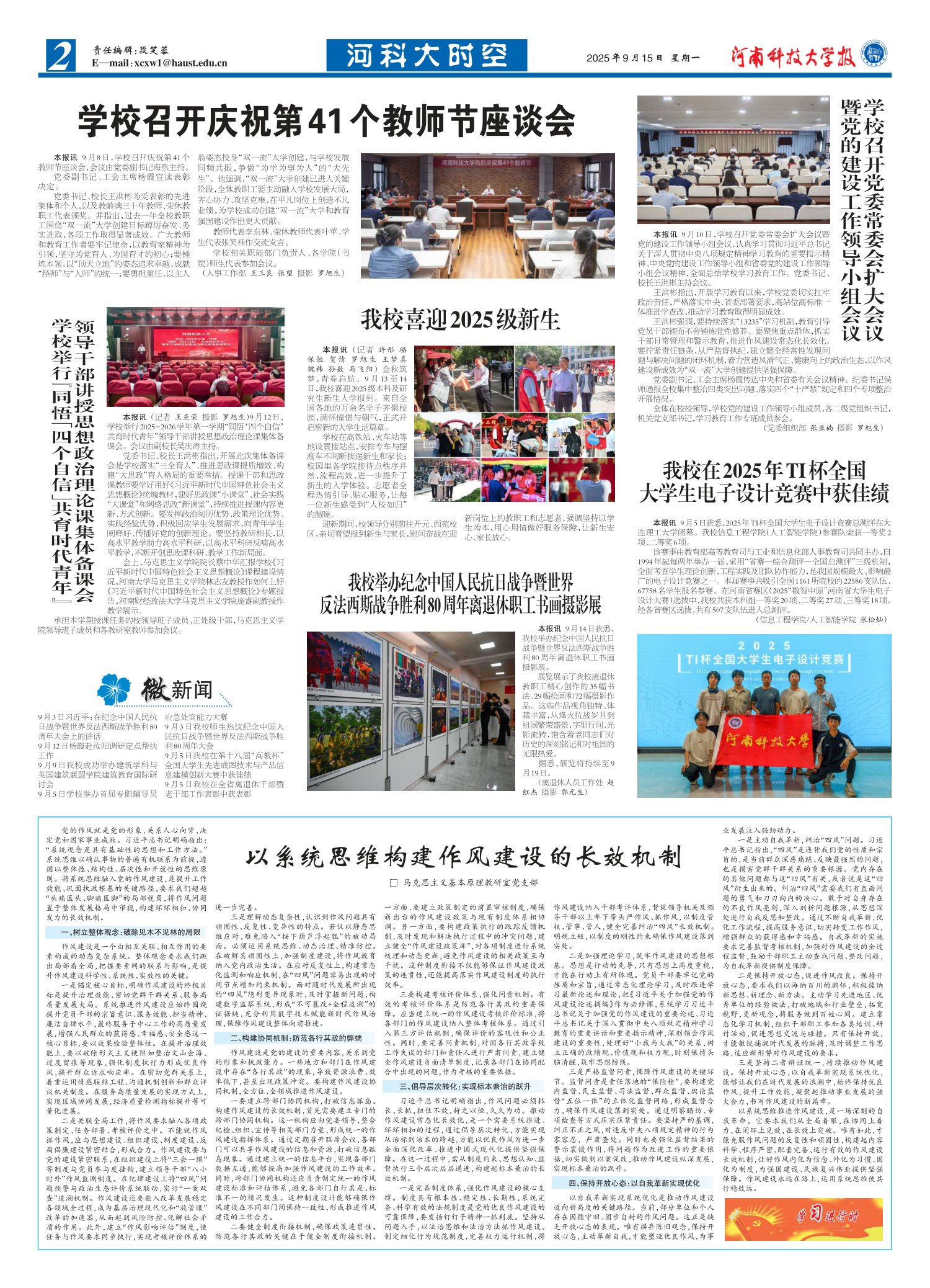 9月3日习近平:在纪念中国人民抗日战争暨世界反法西斯战争胜利80周年大会上的讲话9月12日杨霞赴汝阳调研定点帮扶工作9月9日我校成功举办建筑学科与英国建筑联盟学院建筑教育国际研讨会9月5日学校举办首届