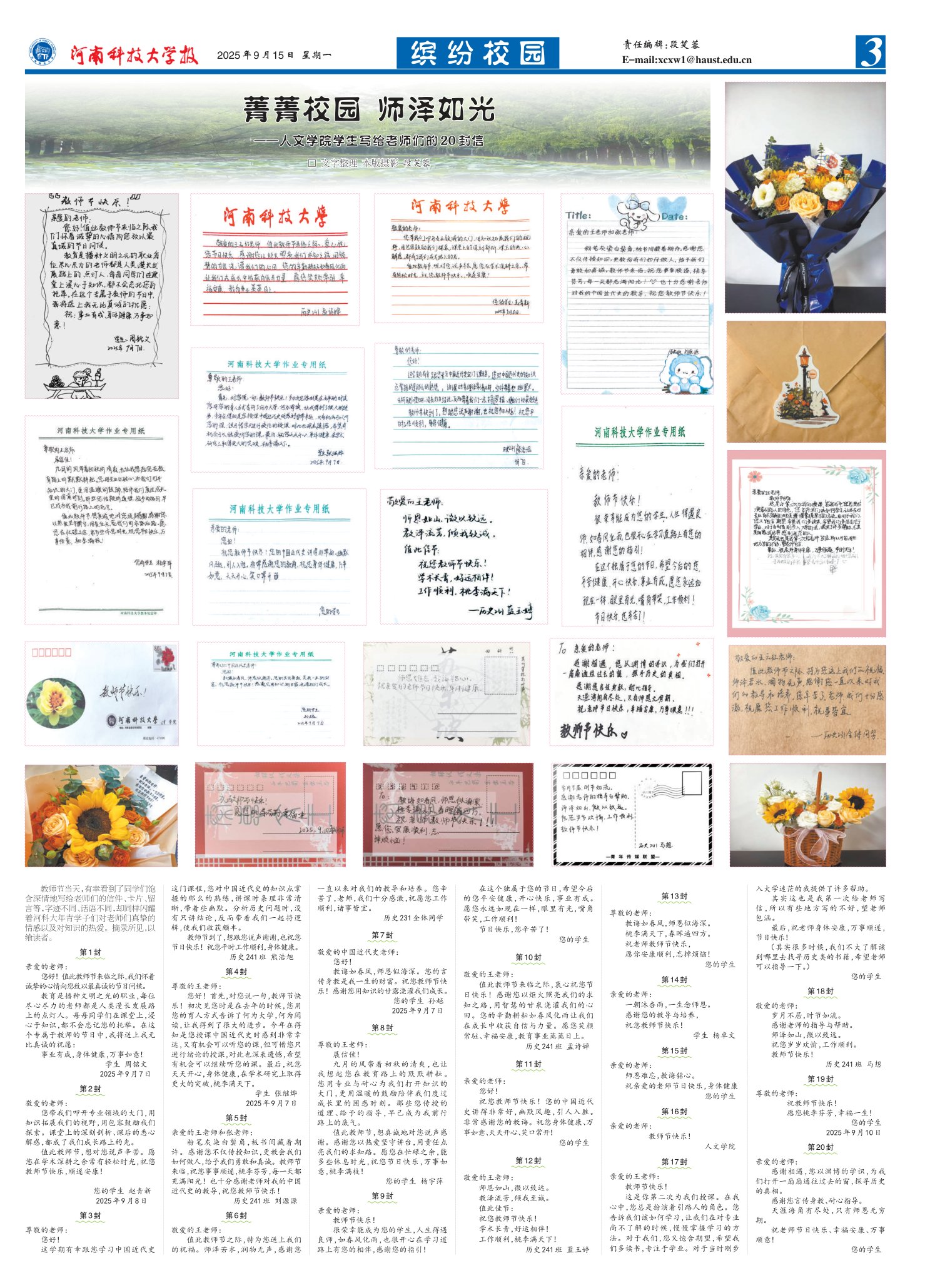 教师节当天,有幸看到了同学们饱含深情地写给老师们的信件、卡片、留言等,字迹不同、话语不同,却同样闪耀着河科大年青学子们对老师们真挚的情感以及对知识的热爱。摘录所见,以飨读者。第1封亲爱的老师:您好!值