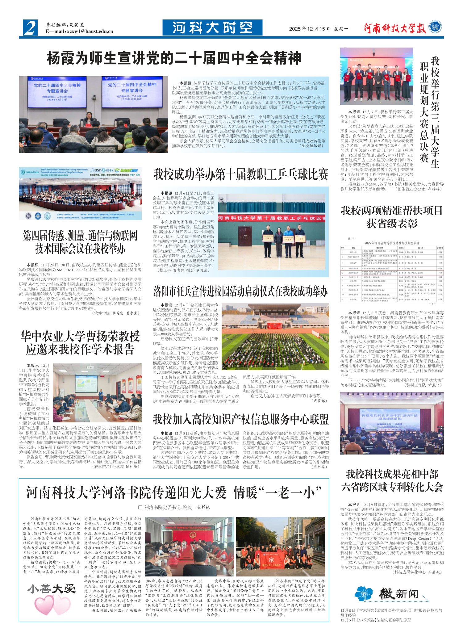 本报讯12月8日获悉,河南省教育厅公布2025年高等学校精准帮扶典型项目评选结果,我校申报的两个项目双双获奖:《四维联动聚合力校地协同促振兴》斩获一等奖,《“互联网+医疗健康”织密健康守护网校地联动筑