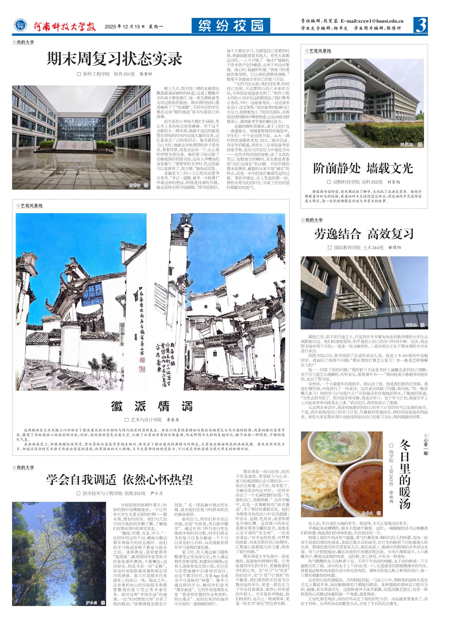 尹小兰摄当校园里的梧桐叶落尽,时钟的指针仿佛被拨快,一个让所有大学生又爱又恨的时期——期末周,便如约而至。我们与几位不同年级的同学聊了聊,了解他们在期末周中的真实状态。“睡觉、听歌、发呆、学习。”一位