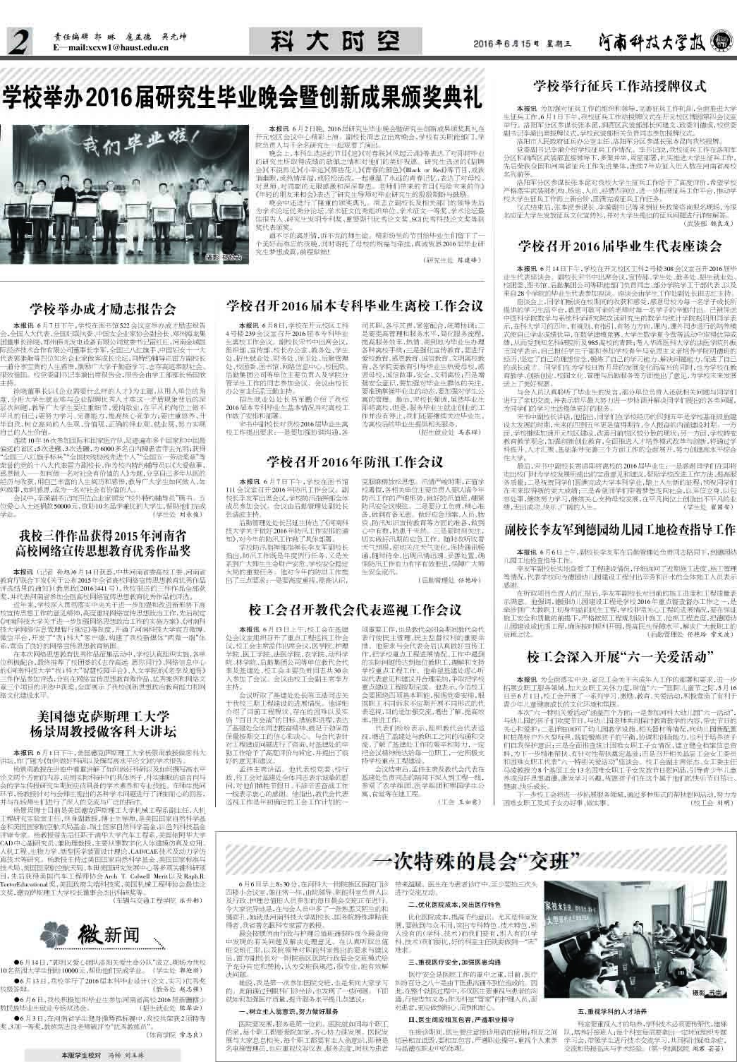 ●6月14日,“郭明义爱心团队洛阳关爱生命分队”成立,现场为我校10名贫困大学生捐助10000元,帮助他们完成学业。(学生处郭迎新)●6月13日,我校举行了2016届本科毕业设计(论文、实习)优秀奖校